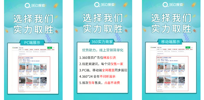 360聯(lián)合仟漁網(wǎng)推出全新360實力商家,PC端+移動端推廣全覆蓋,365天,全國地域,24小時不間斷展現(xiàn),實現(xiàn)了企業(yè)品牌和熱銷商品的雙重全方位的曝光效果。